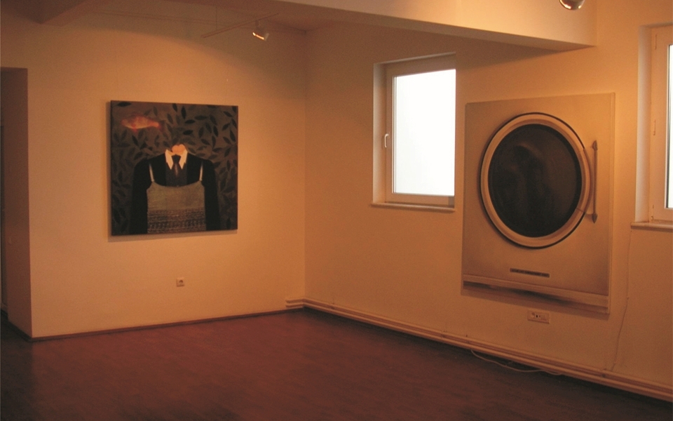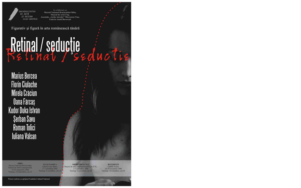 The paintings from the exhibition ‘Retinal/Seduction’ want to attract and to fascinate the eye, to assume an eye-stopper visual status and participatory to co-interest the sensorial sensibility and the imagination/ the imaginary. The temporal high tide is suspended, the flow of seconds it’s stops into an image, the moment captured the attention as if it cute the breath. The images transforms the moments into a cvasi-touchable reality; either the moment – a snapshot of a scanning of a space by presuppose sociability, in which though so to said the key character is common and alone (Marius Bercea) or in which the sociability is from the beginning designate as illusory and the loneliness it lives in group (Mirela Crăciun), or that relevant for the perception of an physical and mental architecture of a society (şerban Savu). It is offered the moment in that the watched ordinary object became obsession object, passion transferred into image (Florin Ciulache) or is propose the sequentially, the double second as to constitute a narration, it itself a moment into another multitude of possible stories (Roman Tolici). The seduction power of the image point out the seduction potential of the object or the gesture, presents sometimes hypnotically and capable to produce the psychological – perceptive side-slip or hermeneutic into phantasmagoric, psychedelic or the most natural and human sentimental, without to exclude the precision of a strong realism (Oana Fărcaş). The face-image is it shaped with gentility and it is given to the eye thru a precise technical elegance (Kudor Duka István), and the dream irrupts into an objectual simplicity tricky decorative (Iuliana Vîlsan).