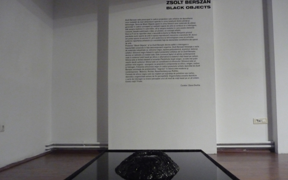 The “Black Objects” by Zsolt Berszán becomes in this way a query about the corporal bipolarity to the decomposition of organic body. Zsolt Berszán uses a series of industrial materials: black silicone, polyurethane foam, aluminum, concrete, asphalt. Black silicon used in the Zsolt Berszán�s artistic project becomes a leitmotif of his work. It is known that modern science see the life system silicon-based an alternative of the life system based on carbon. Silicium is the second element of the Earth’s crust after oxygen, which is less reactive than carbon. Silicium is a constituent of silicon. Silicone is a mixed polymer organic – inorganic that has in its composition, oxygen, carbon and hydrogen. Using black silicone in the framework of the art project developed by Zsolt Berszán reminds the “black” problematic from the modern and contemporary art history – Malevich, Richter, Rauschenberg and Rothko.