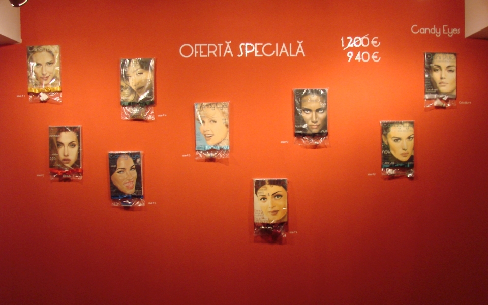 “Candy Eyes” represents the image of some of the most famous feminine stars appearing on the cover of an imaginary magazine. The image of the stars overlaps with satiric or comical texts found or quoted by famous individuals.