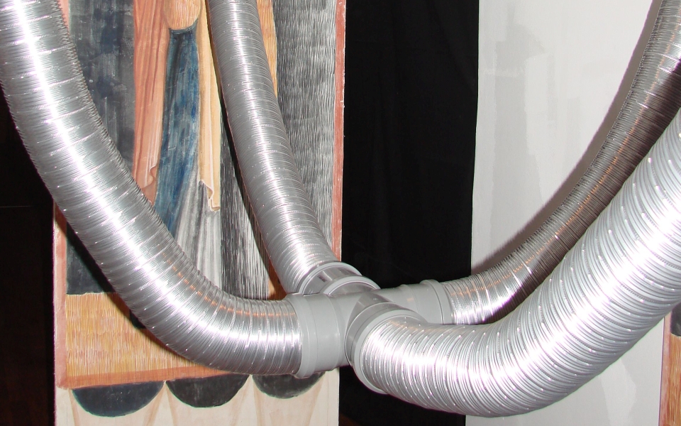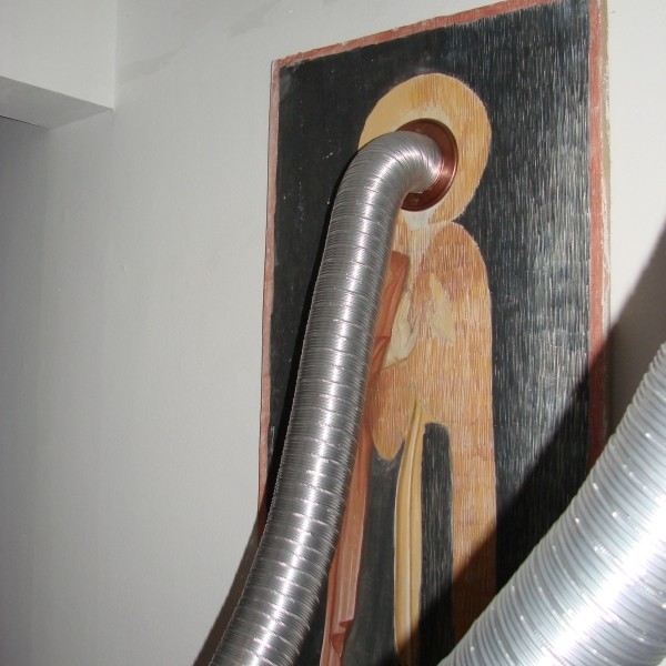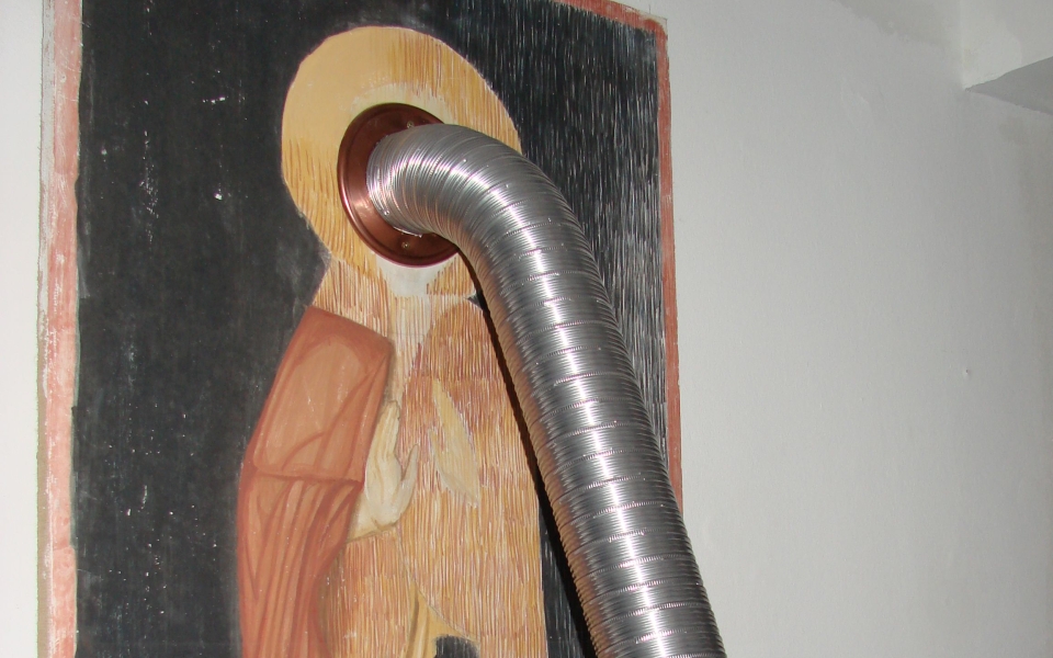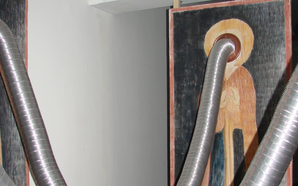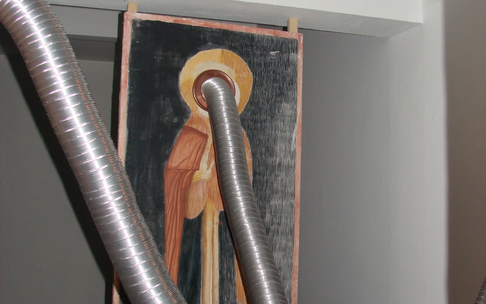 Justin Baroncea, Andrei Dinu and Radu Enescu designed an installation starting form the initial model, creating a dialogue between four identical human sized Saints. The four identical Saints communicate with the help of some fan noises located in intersected pipes.