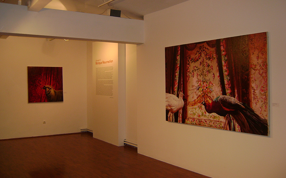 Human presence is rather induced than physical in Fikl’s works. And when it appears, the feminine character is often full of mystery and hidden behind black lacery that offers to the viewer a distinctive touch of sensuality. However, the presence of animal and bird symbols is quite obvious. The series of bucks, sheep and goats on the background of red curtains imitating brocart or in front of altars that make reference to the mystic lamb, send us to the idea of supreme sacrifice havingeschatological meanings.
